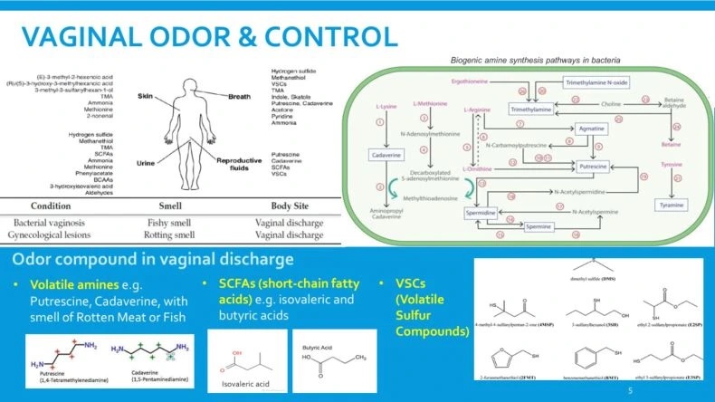 จากแผนภาพด้านบนจะเห็นได้ว่า แบคทีเรียที่ก่อให้เกิดกลิ่นไม่พึงประสงค์ในช่องคลอดนั้น มีหลายชนิด และแต่ละชนิดก็สร้างสารประกอบที่มีกลิ่นเหม็นต่างกันไป เช่น