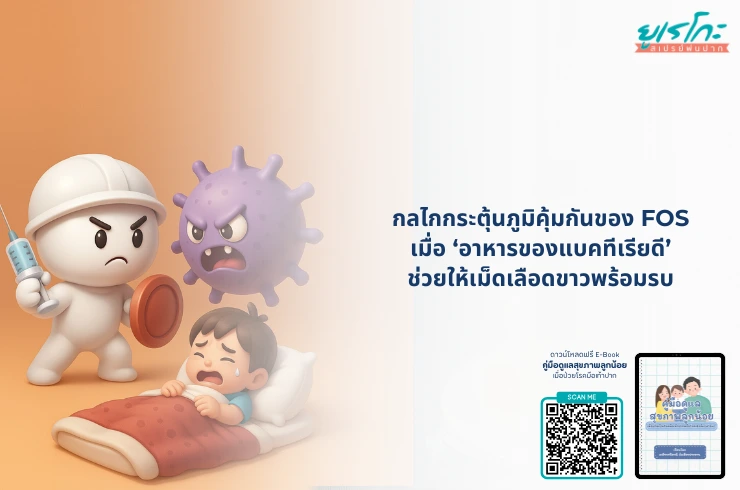 พรีไบโอติก (Prebiotic) เช่น Fructooligosaccharides (FOS) ไม่เพียงเป็น “อาหารของแบคทีเรียดี” ในลำไส้ แต่ยังส่งผลถึง “ระบบภูมิคุ้มกัน” ของร่างกายอย่างลึกซึ้ง บทความนี้จะเจาะลึกว่าหลังจากรับประทาน FOS เช่น ใน Eureko Fructo แล้ว แบคทีเรียดีที่เพิ่มจำนวนมากขึ้นช่วยกระตุ้นเซลล์สำคัญอย่าง macrophage, dendritic cell และ T-cell ได้อย่างไร จนเสริม “non-specific immune response” ของร่างกายให้พร้อมต่อสู้เชื้อโรคต่าง ๆ รวมถึงไวรัสมือเท้าปาก (HFMD)
