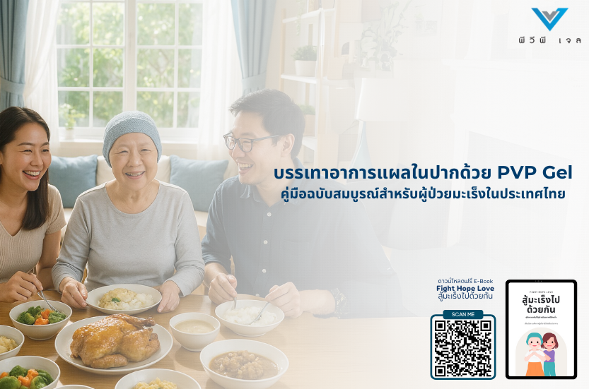 “เราเข้าใจดีว่าการต่อสู้กับมะเร็งเป็นเรื่องยากลำบากเพียงใด และความเจ็บปวดจากแผลในปากยิ่งเพิ่มภาระให้หนักขึ้น ให้ PVP Gel เจลบรรเทาแผลในปาก พร้อมอยู่เคียงข้างคุณในการบรรเทาความทุกข์ทรมานนี้ เพื่อช่วยให้คุณมีวันที่ดี มีคุณภาพชีวิตที่ดี พร้อมทั้งกายที่แข็งแรง จิตใจที่เข้มแข็ง เราจะผ่านวันที่ยากลำบากนี้ไปด้วยกัน”