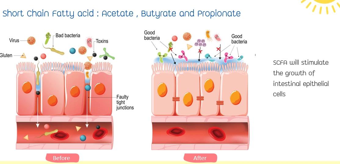 • ดูดซึมสารอาหารได้ดียิ่งขึ้น: พรีไบโอติกไม่ได้ช่วยเพิ่มประสิทธิภาพในการดูดซึมสารอาหารโดยตรง แต่เมื่อแบคทีเรียดีในลำไส้ย่อยพรีไบโอติกแล้ว จะเกิดสารที่มีประโยชน์หลายอย่าง หนึ่งในนั้นคือ กรดไขมันสายสั้น (Short-Chain Fatty Acids หรือ SCFA) ซึ่งเป็นแหล่งพลังงานสำคัญสำหรับเซลล์ลำไส้ ทำให้เซลล์เหล่านี้แข็งแรงและทำงานได้อย่างมีประสิทธิภาพมากขึ้น เมื่อลำไส้แข็งแรง ก็จะสามารถดูดซึมสารอาหารสำคัญ เช่น แคลเซียมและแมกนีเซียม ได้ดีขึ้น นอกจากนี้ SCFA ยังช่วยกระตุ้นการสร้างเซลล์ลำไส้ใหม่ ทำให้ผนังลำไส้แข็งแรงขึ้น ลดช่องว่างระหว่างเซลล์ (tight junctions) ป้องกันไม่ให้แบคทีเรียร้ายหรือสารพิษเล็ดลอดเข้าสู่กระแสเลือด ลดความเสี่ยงในการเกิดการอักเสบและการติดเชื้อ