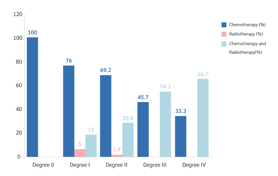 จากกราฟจะเห็นได้ว่าผู้ป่วยที่ได้รับการรักษาแบบเคมีบำบัดมีโอกาสเกิดเยื่อบุช่องปากอักเสบได้มากกว่าการรักษาแบบรังสีรักษา เช่น 76-69.2% ของผู้ป่วยจะมีภาวะเยื่อบุช่องปากอักเสบในระดับ 1 และ 2 ตามลำดับ แต่วิธีการรักษาแบบที่ใช้ทั้งเคมีบำบัดและรังสีรักษามีโอกาสเกิดแผลในระดับ รุนแรง (โดยเฉพาะในระดับ3และ4) มากกว่าการรักษาโดยใช้วิธีใดวิธีหนึ่ง จากกราฟจะเห็นได้ว่าผู้ป่วย 54.3-66.7% ที่ได้รับทั้งเคมีบำบัดหรือรังสีรักษา จะเกิดภาวะเยื่อบุช่องปากอักเสบในระยะที่ 3 และ 4 ตามลำดับ