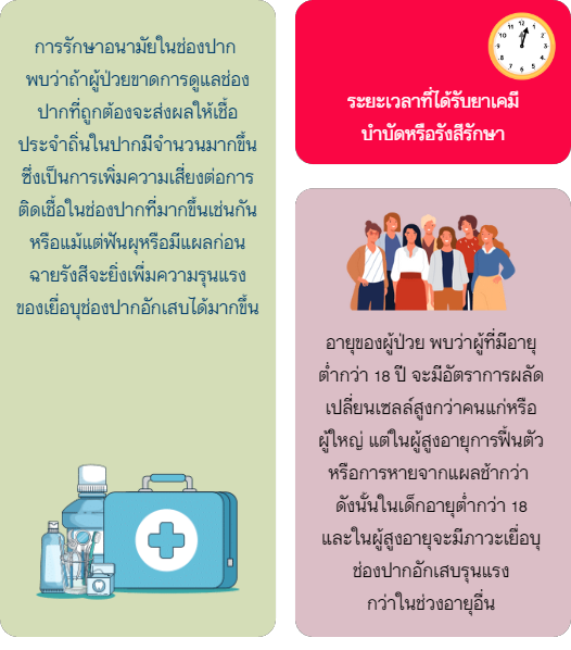 ภาวะเยื่อบุช่องปากอักเสบจัดเป็นภาวแทรกซ้อนหนึ่งที่คุกคามคุณภาพชีวิตของผู้ป่วยโรคมะเร็ง