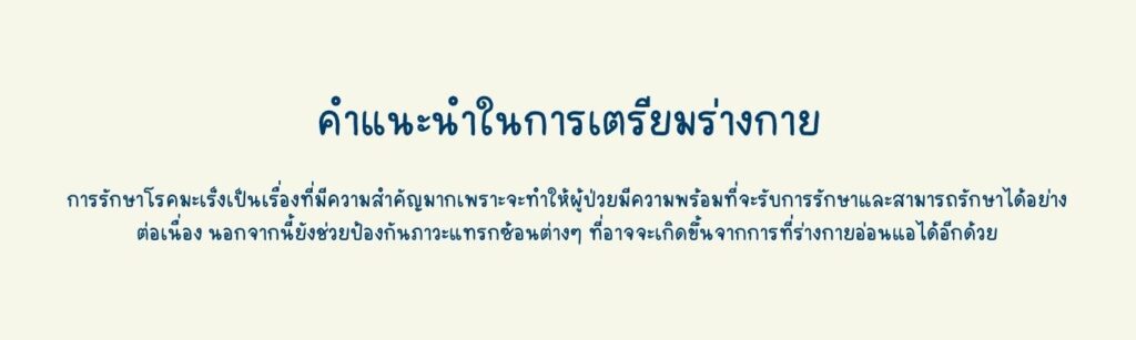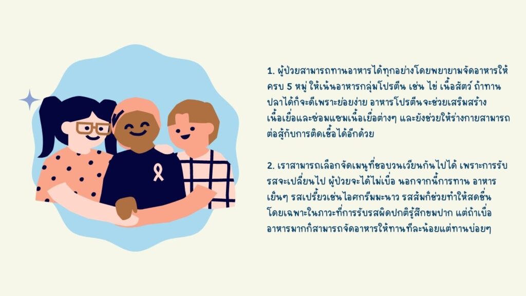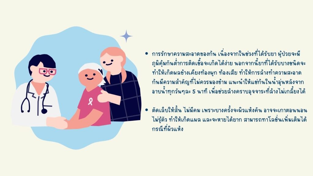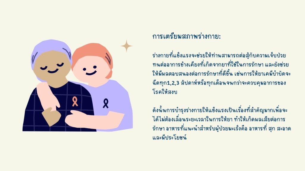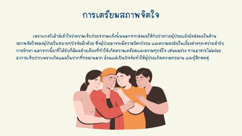 สิ่งสำคัญสำหรับผู้ป่วยที่ต้องเข้ารับการรักษาด้วยเคมีบำบัด คือสภาพจิตใจที่ต้องเตรียมพร้อมที่จะเผชิญหน้ากับการรักษา รวมไปถึงกำลังใจจากรอบข้างของคนในครอบครัวเองก็สำคัญเช่นกัน