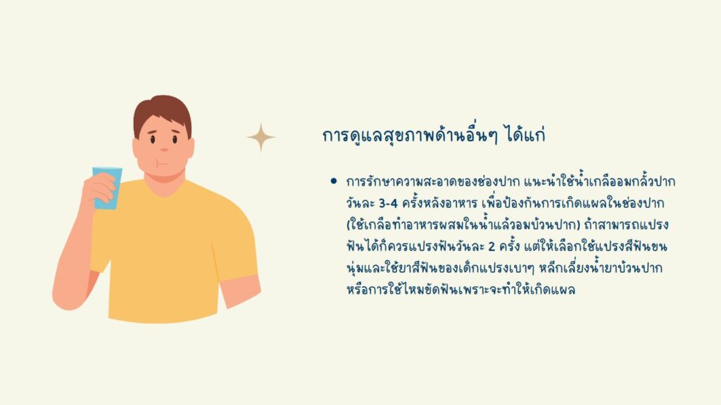 การรักษาความสะอาดและเพิ่มความชุ่มชื้นในช่องปาก เช่นการแนะนำการแปรงฟัน หรือการดื่มน้ำ 2 ลิตร/วัน