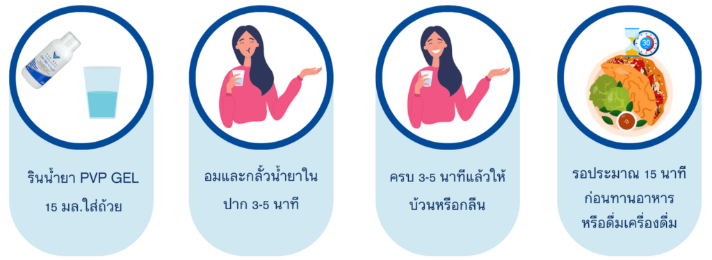 - PVP GEL จะเคลือบแผลช่วยให้อาการเยื่อบุช่องปากอักเสบหายได้เร็วขึ้น