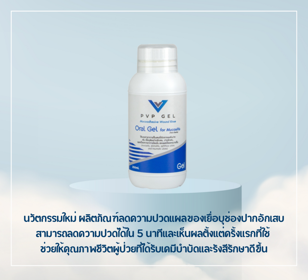 PVP Gel ผลิตภัณฑ์กลั้วปากสำหรับบรรเทาแผลในปากที่เกิดจากการรักษาเคมีบำบัด หรือแผลผ่าตัดในช่องปาก สามารถอม กลั้วปากทิ้งไว้แล้วคายทิ้งหรือกลืนเข้าไปได้โดยไม่มีอันตราย ซึ่งข้อดีของ PVP Gel ก็คือ
